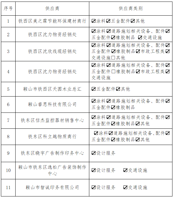 根據(jù)2024年5月11日發(fā)布的《供應(yīng)商入庫公告》要求,經(jīng)過報名篩選和資質(zhì)審查等程序,確定了11家供應(yīng)商符合入庫條件?,F(xiàn)公布經(jīng)過篩選的供應(yīng)商入庫清單,名單如下: